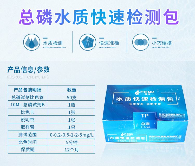 3.水體中磷主要以較穩定的磷酸根離子形式存在,故本產品以測定磷酸根離子來判斷水中總磷含量。
